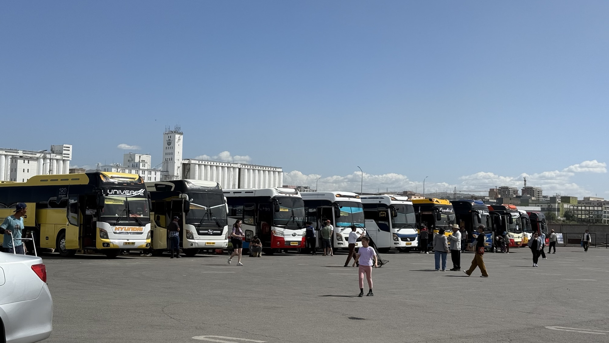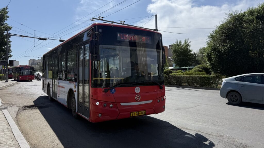 ホテルとバスターミナルはともに同じ幹線道路に面しているため、繋いでいるバス路線が複数あります。近くのバス停からч:13路線のバスに乗車。運賃500トゥグルグ(約20円)