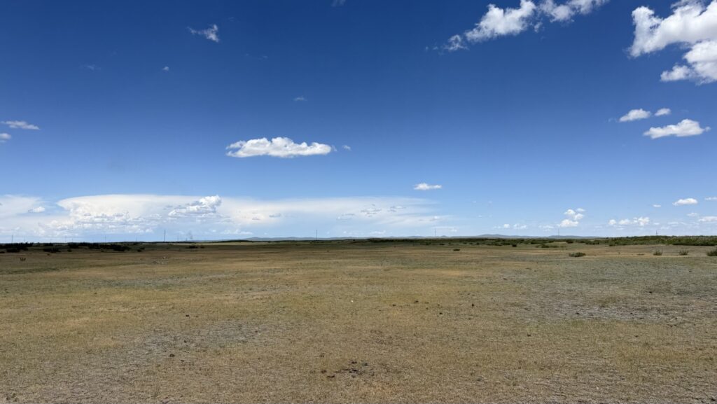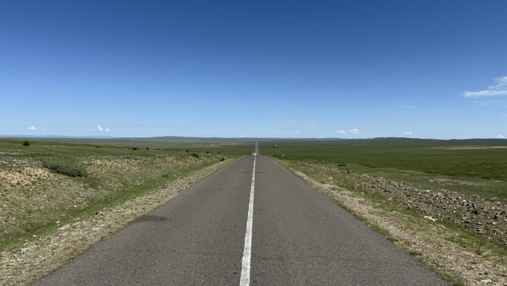 10時にゲストハウスを出発。すぐに町を抜け、大草原の中にまっすぐな道が続きます。