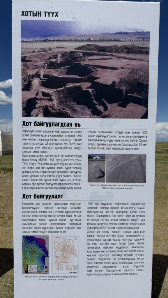当時のカラコルムは政治・経済・文化の中心地で、仏教寺院や宮殿、商業地区が整然と配置されていました。現在は城壁や建物の基礎、僧院跡などが残るのみですが、遺跡からは当時の都市計画や交易の規模をうかがい知ることができます。
