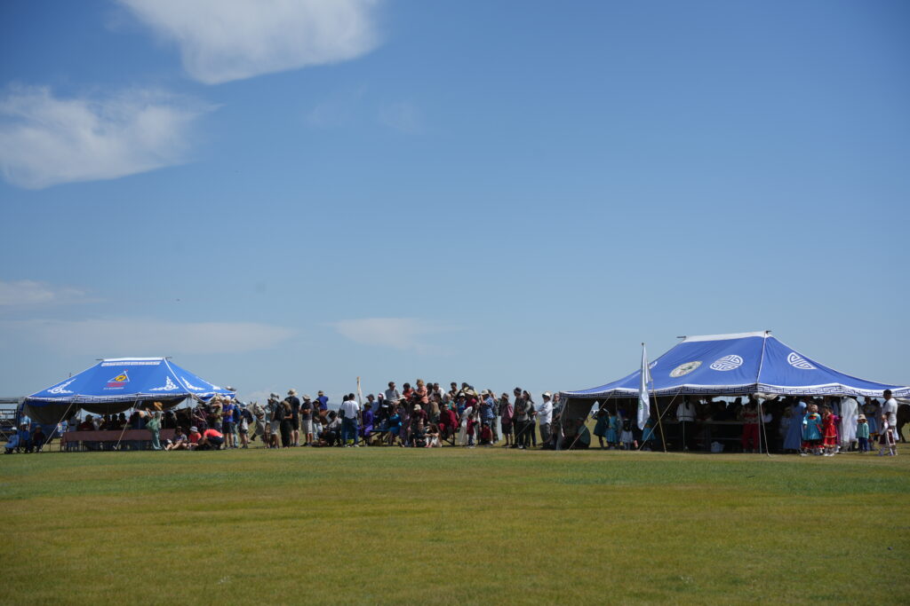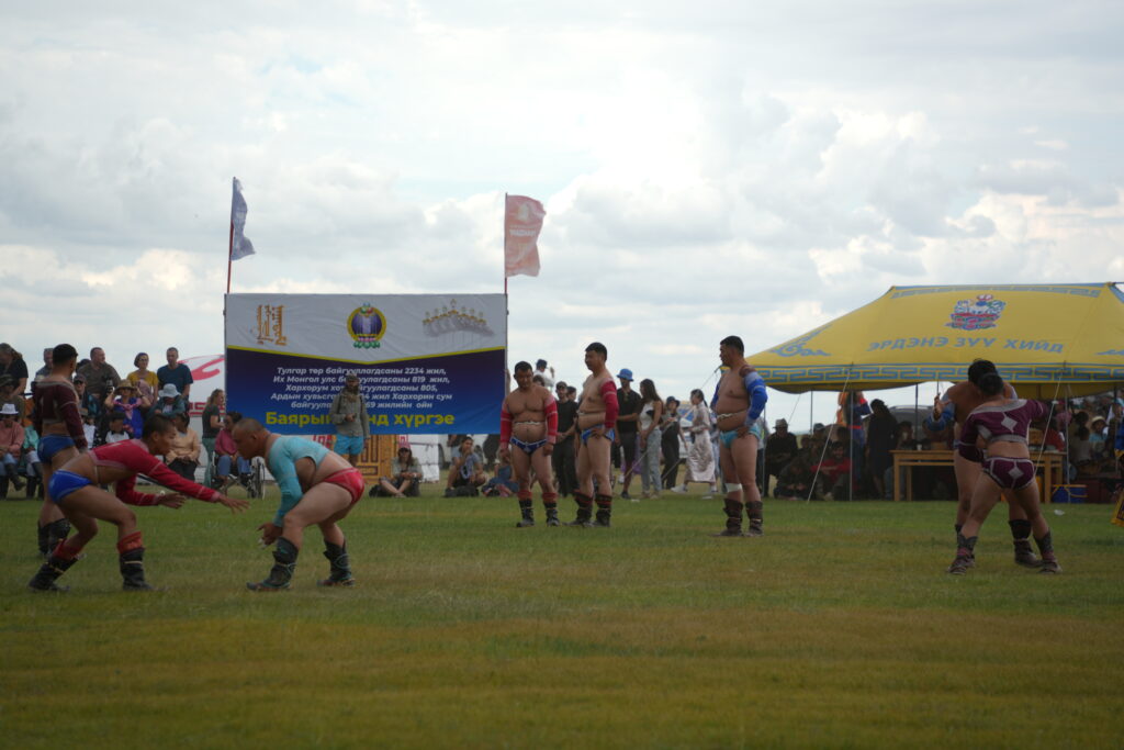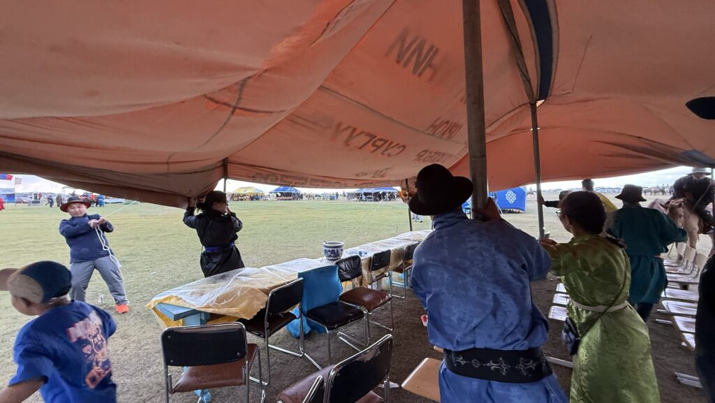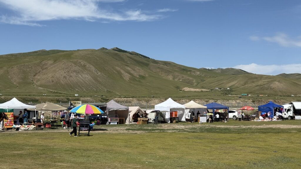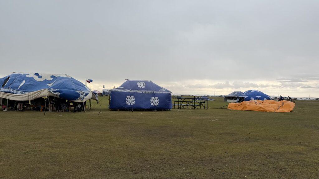 一方、カラコルムなど地方都市や村々では同じ時期によりローカルなナーダムが開かれます。カラコルムの人口は1.5万人くらいのため、日本で言うと小さめの市とかの体育大会みたいなイメージでしょうか。会場は郊外の草原に作られ一チケットも不要です