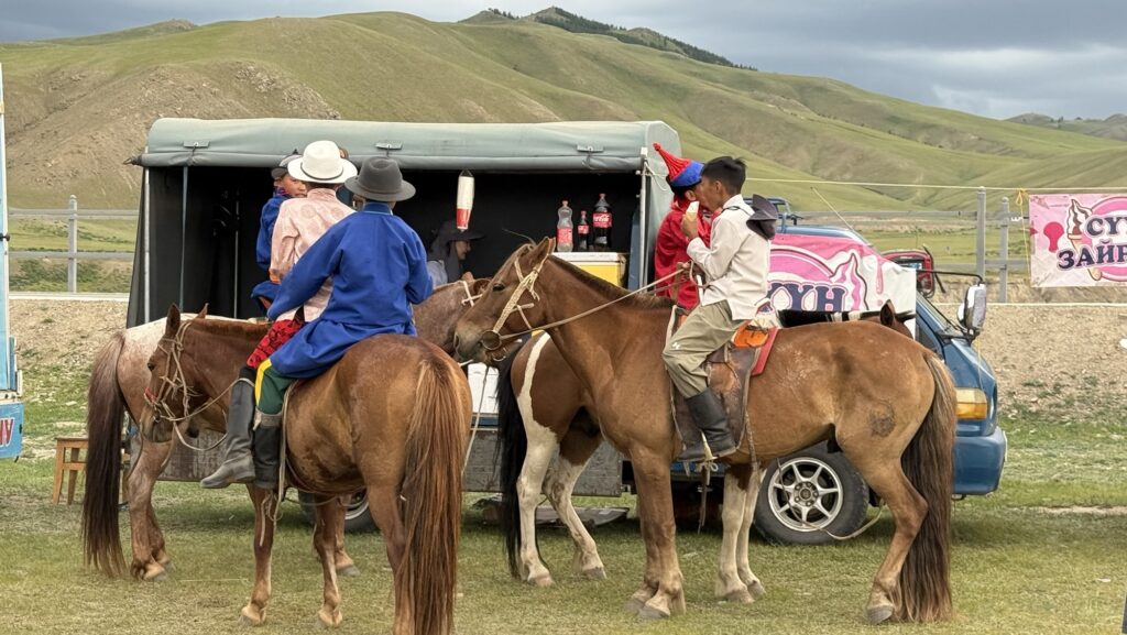 馬に乗ったまま屋台に並ぶ若者たちも多くいます。馬の後ろには人は並べないので、自然と馬用の屋台と人用の屋台みたいに分かれていくのがちょっと面白い。