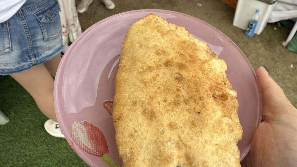 揚げ餃子みたいなものなんですが思ったより大きい。タレとかは特につけず、味付けは塩と胡椒だけ。皮は日本の揚げ餃子よりは分厚く、触感と中の肉の風味を味わう感じです。