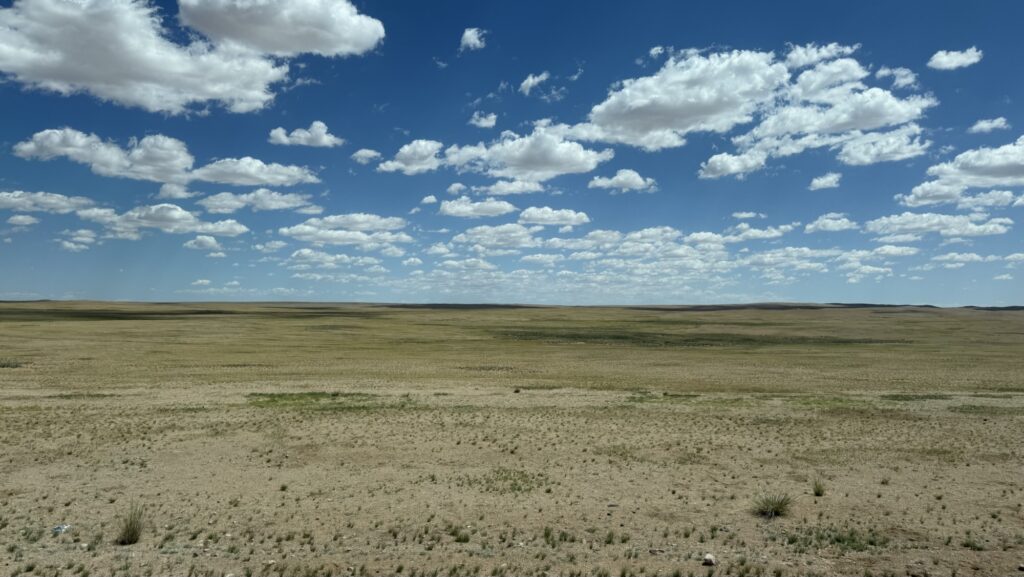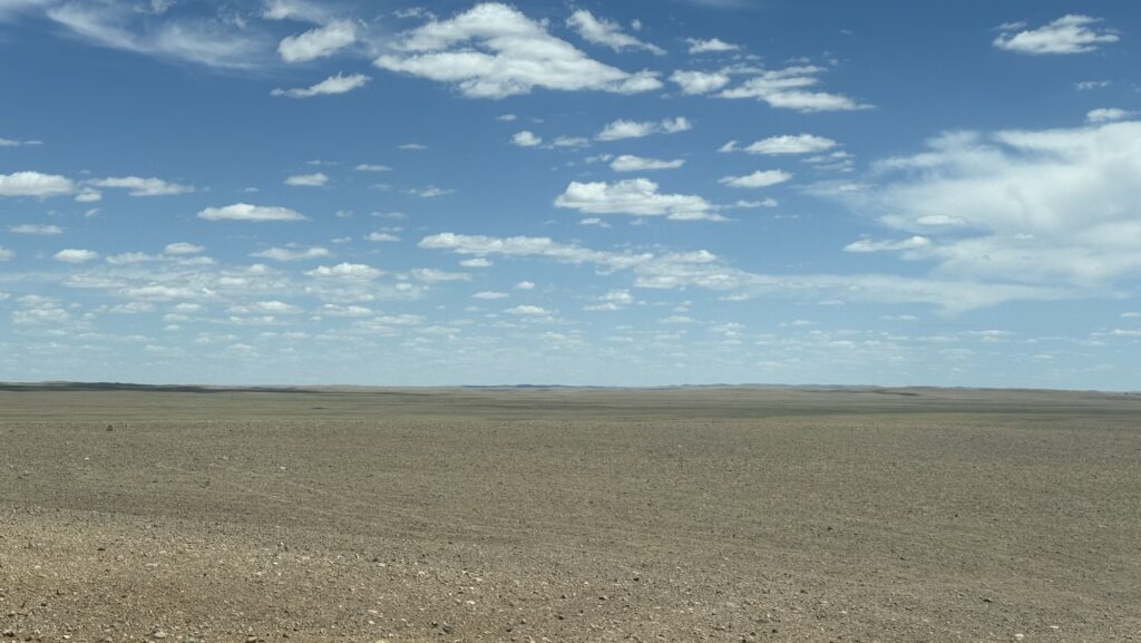 その後、しばらくは広大な平原が続き、昼前になると景色にだんだん砂漠の気配が混じり始めました。空気が乾燥しているためかいつもより喉が渇きます。