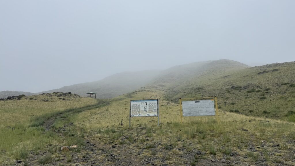 約二時間ほど荒野を走り、目的地の「ハフツガイト岩絵群」に到着しました。小高い丘の中腹に駐車場(ただの空き地)があり、見上げると丘の上に続く登山道が見えます。