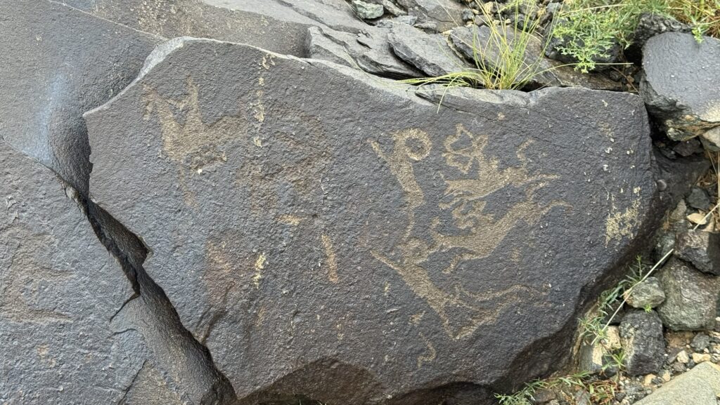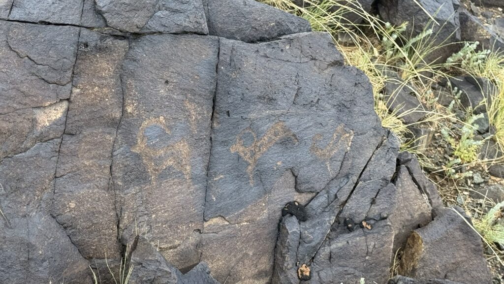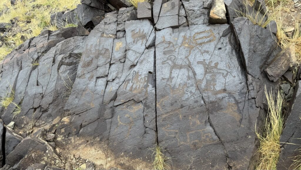 動物の書き方も直線中心のシンボリックなものや丸みのある躍動感が感じられるものまで様々。以前に見たタバン・ボグドのシンプルな岩絵とはまた違う印象を受けます。