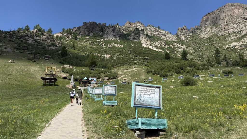 入場料は5,000トゥグルグ(約200円)。仏教の教えが並ぶ参道を登った先にマニ車が見えます。
