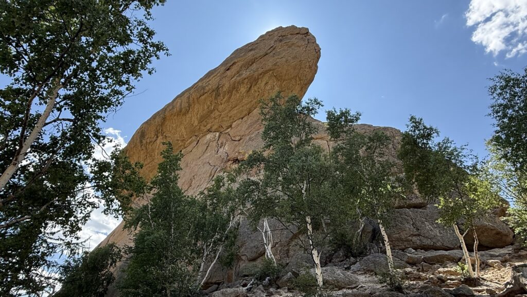 北側から岩の中腹まで登れるようになっています。遠くからは大きな岩が組み合わさっているように見えましたが、近づくと表面の風化の痕跡がよくわかります。