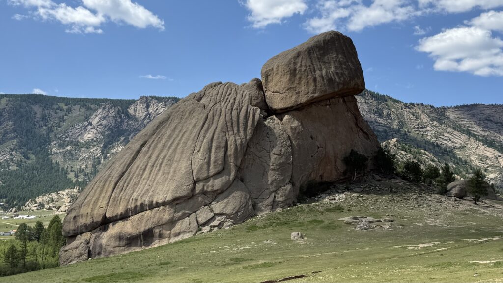 テレルジ国立公園の「亀石」は、数千万年という長い時間をかけて形成された花崗岩の奇岩です。風や雨、寒暖差による風化や浸食が少しずつ岩を削り、現在の亀が首を伸ばしたようなユニークな姿になりました。