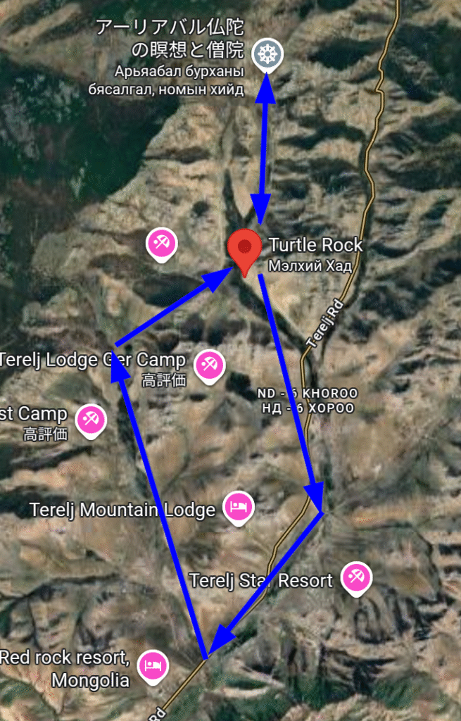 今日はテレルジ国立公園を観光します。公園内の観光スポットとして亀石と寺(アーリアバル僧院)が有名なので歩いて行ってみることにします。