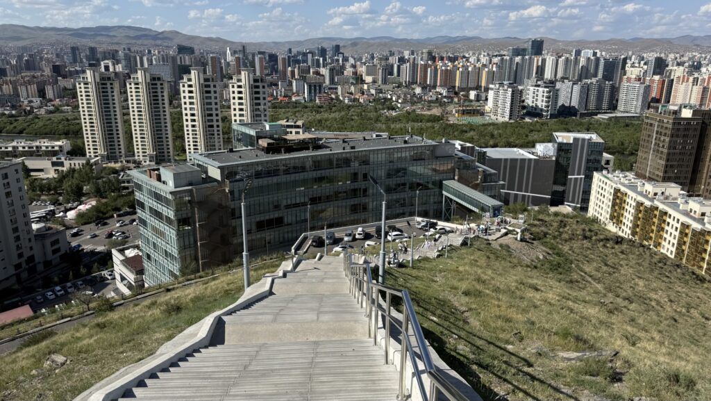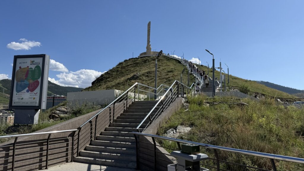 この丘へは麓からおよそ600段の階段を上る必要があります。頂上からはウランバートル市街はもちろん、トゥール川や周囲の山々まで360度見渡せる絶景が広がります。
