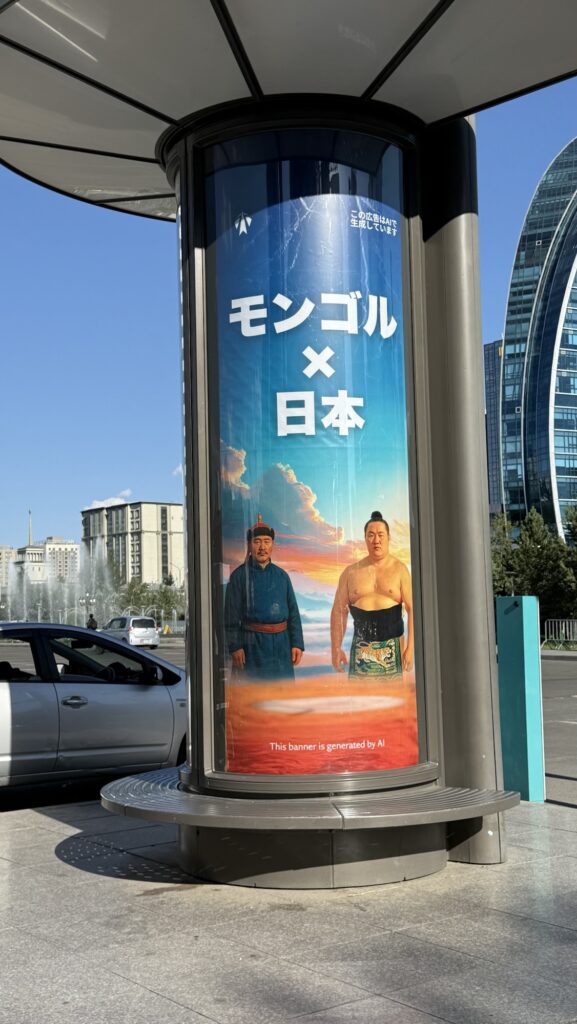 路上に謎の生成AI広告が。モンゴルx日本で何をPRするものなのかよくわかりません。