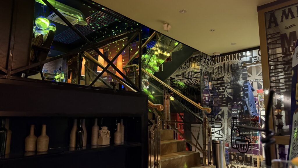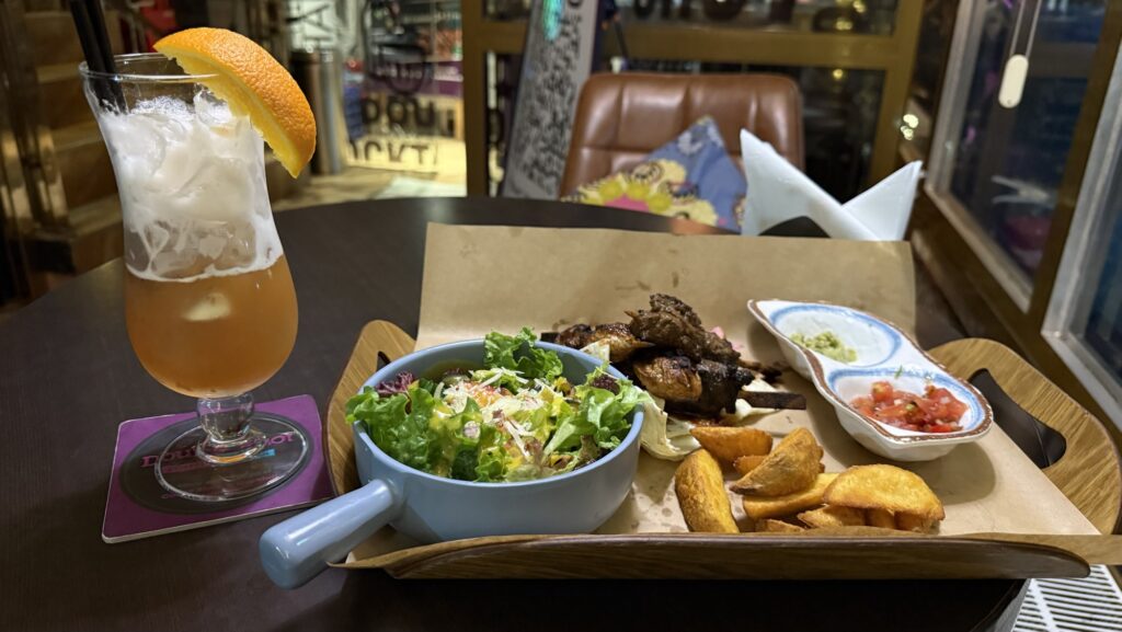 カクテル(ラムパンチ)と串焼きの盛り合わせ的なもので74,000トゥグルグ(約3,000円)。賑わっていますがうるさくはなく、一人でも入りやすいです。