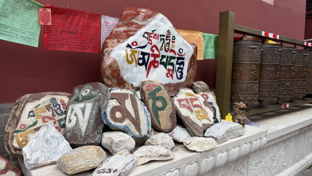 屋根の上のヴァジュラ(金剛杵)やタルチョ(五色の布)、入り口のマニ車とかはチベット仏教っぽい。