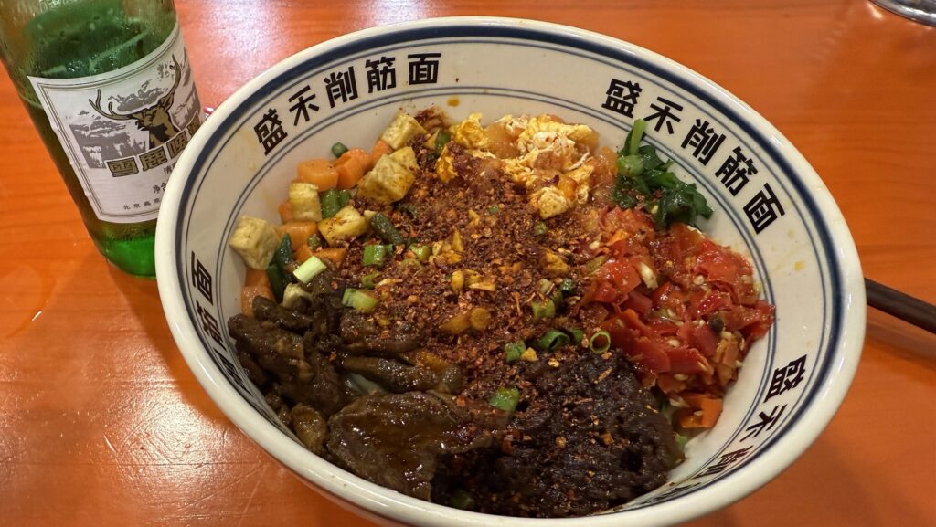 夕食は近くの麺屋で、西红市鸡蛋油泼というトマトと卵料理が乗った謎の麺(14元、約280円)。
