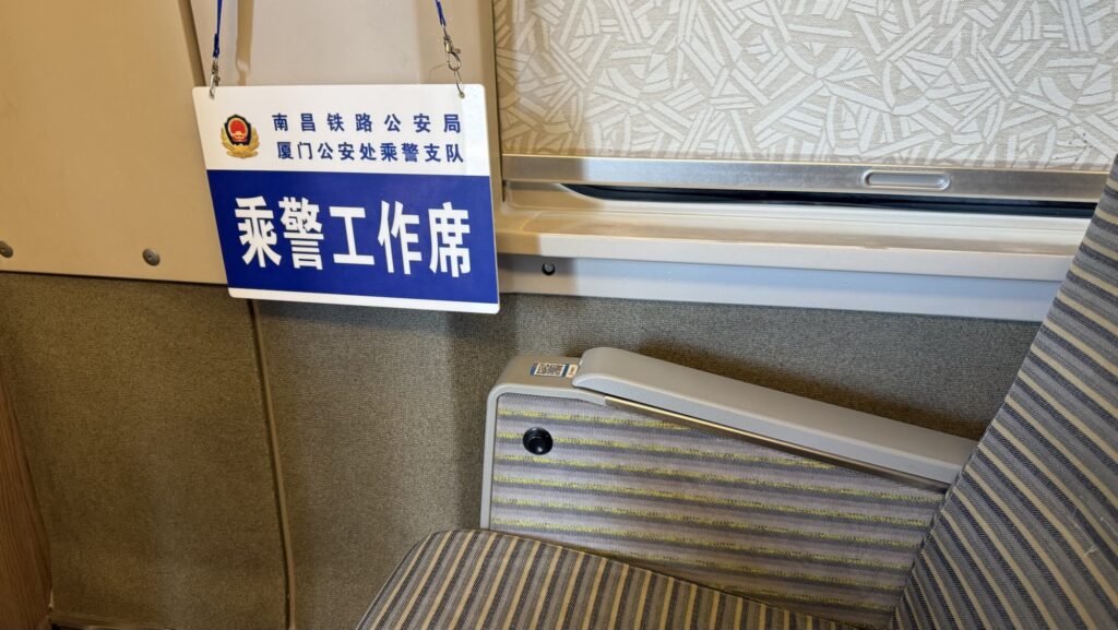 車両の最前列には公安の人が乗っており治安はバッチリです。一部の列車だか車両にはこうした公安専用席が設けられています。一等車に乗って車両警備とかうらやましい仕事です。