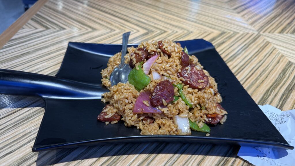 四川腊肠炒饭(四川風のソーセージチャーハン)を頼んだら調理に使ったフライパンがそのまま出てきました(18元、約360円)。見た目的にはお洒落なデザインの食器に見えなくはない。