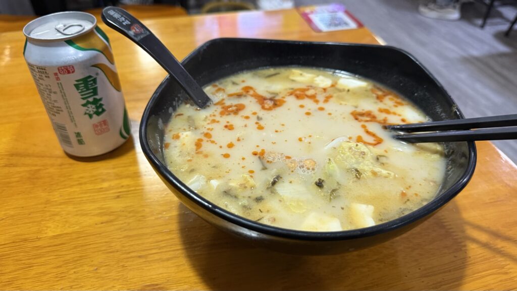 夕食は近くの食堂で「魚粉」という麺料理を(15元、約300円)。これは魚介のスープに春雨みたいな麺をいれたものらしい。