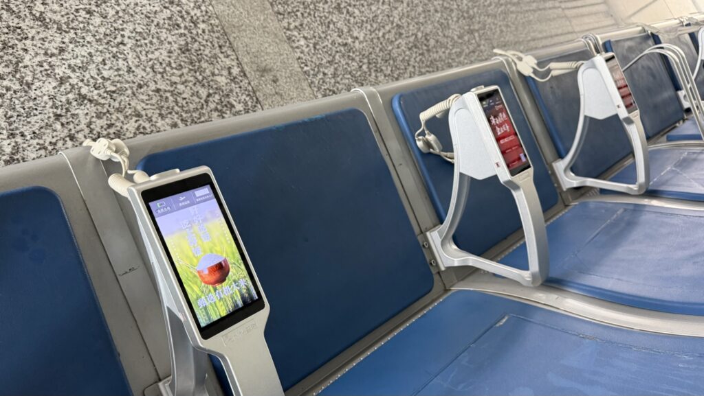 駅だと壁際に充電スペースが設けられていることが多いのですが、ここでは各座席の脇に謎の端末がありケーブルをつないで充電できます。何されるかわからないのでちょっと怖くて繋げません。