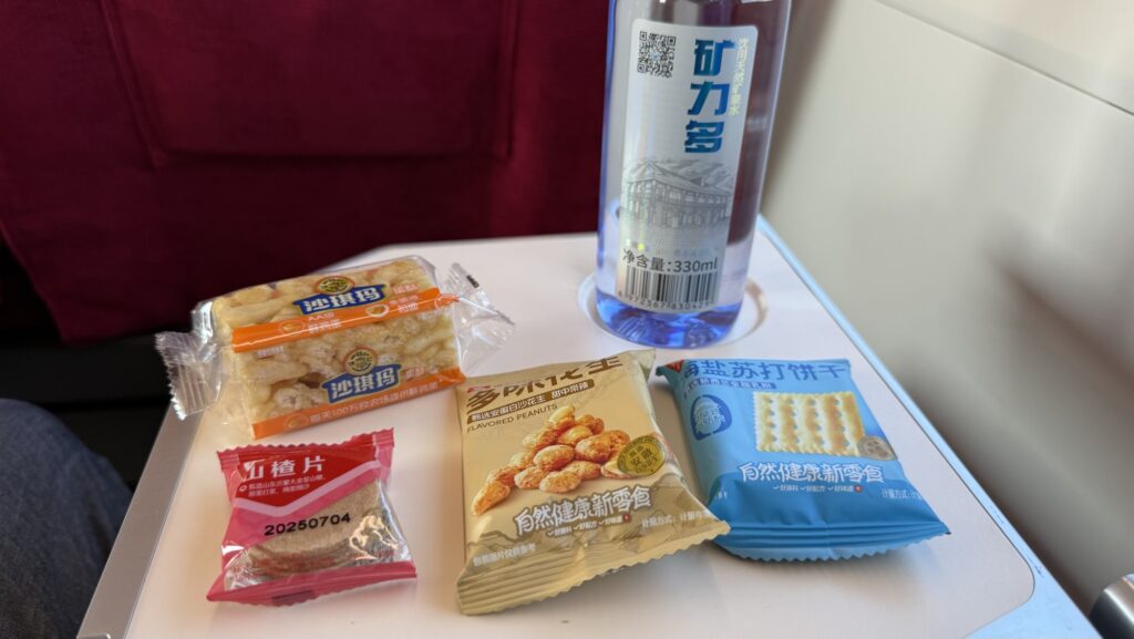 乗車時間は短いですが軽食は出ました。左下の山楂片という山査子(サンザシ)をペーストにしたお菓子がしっとりとした食感と干し梅みたいな甘酸っぱさでおいしい。