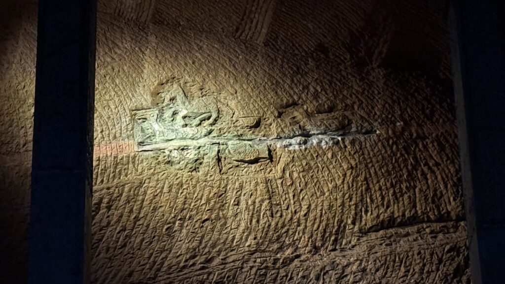 この第一窟の天井付近の壁際には謎の彫刻が刻まれています。これは窟内に現存する唯一のものだそう。