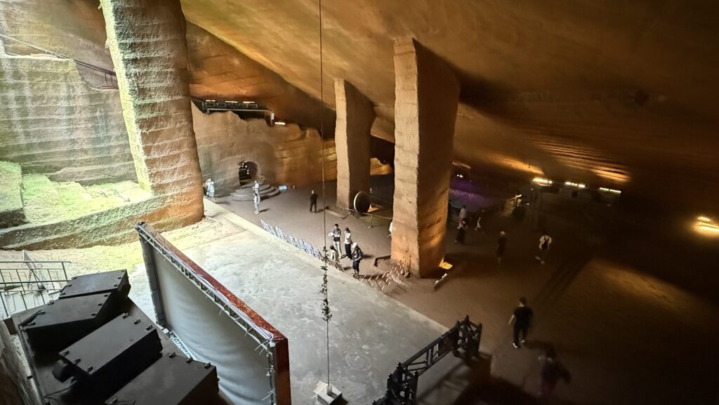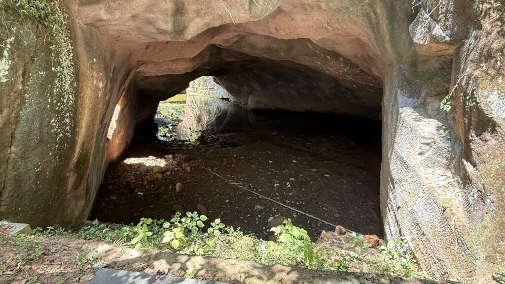 二つ目の洞窟はかなり大きく、大きな採光口とステージらしきものがあります。このステージも当時からあったのか、イベントのために造ったのか謎です。