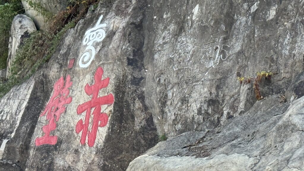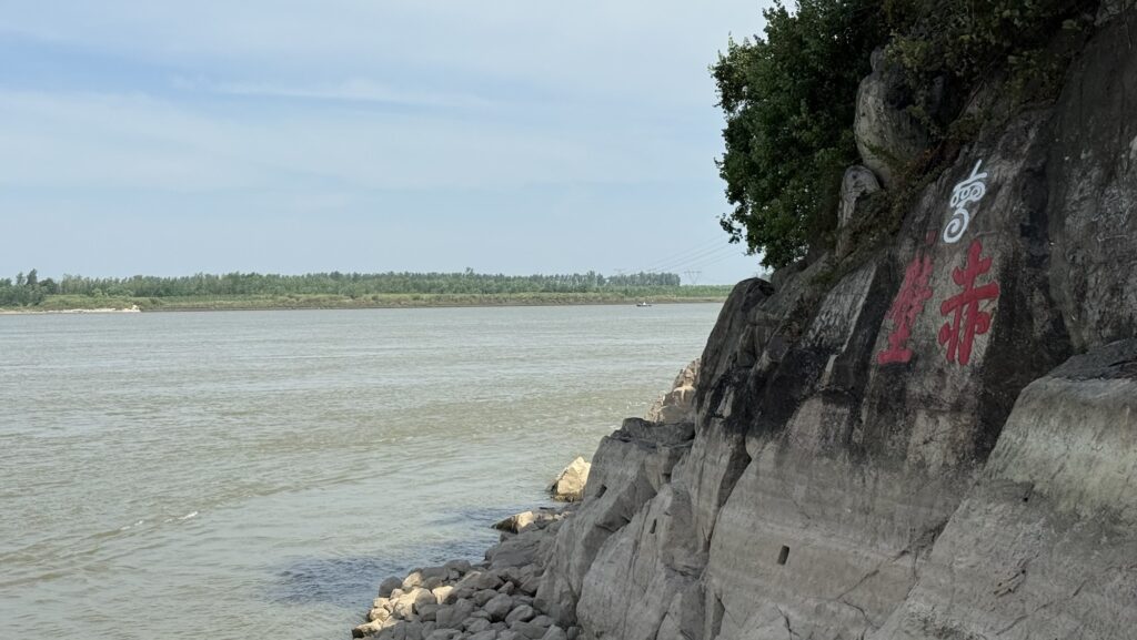 古戦場は、長江沿いの岩壁に摩崖石刻が刻まれているだけです。此岸側に周瑜軍、対岸側に曹操軍がいたはず。1800年ほど前の戦いの様子が今に残っているというのはすごいな(正確な場所についてはまだ議論があるそう)。