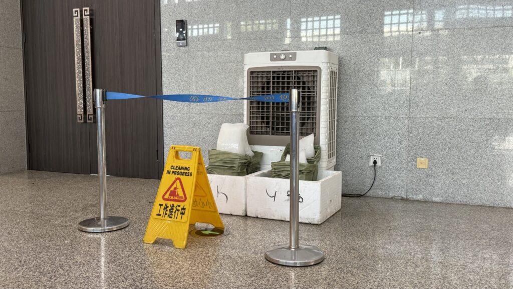 今の気温は40度ほど。駅の待合スペースに冷房はないため、送風機の前に氷が置かれていました。