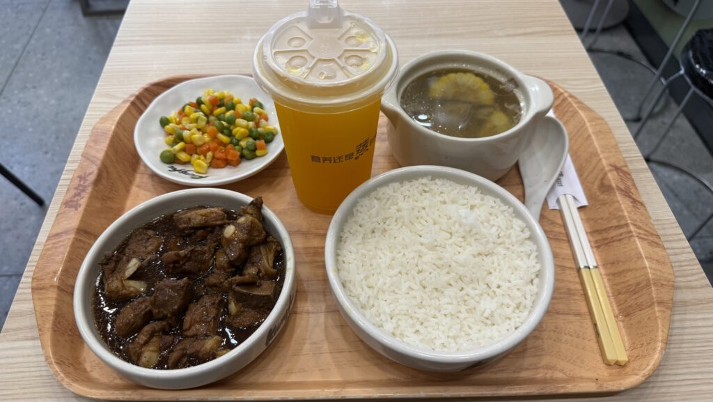 昼食は安心の「李先生」で食べて、夕食は「真功夫」というチェーン店へ。こちらは今日初めて入りました。排骨飯的なやつのセットで64元(約1,280円)。