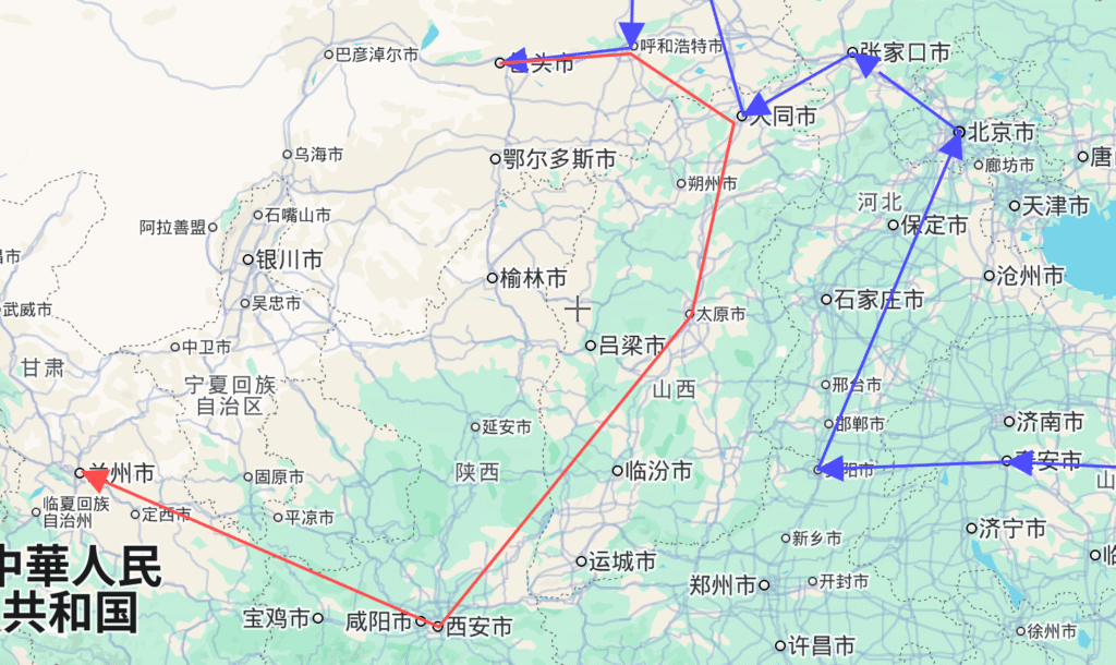 料金は一等で約2.2万円(二等なら1.3万円)。パオトウから一度フフホト-大同と戻り、太原-西安を経由する大回りのルートとなり高めです。