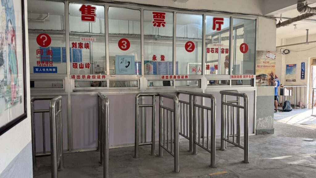 通路を進むと小さなバスターミナルがありました。窓口で劉家峡までのチケットを購入(23元、約460円)。