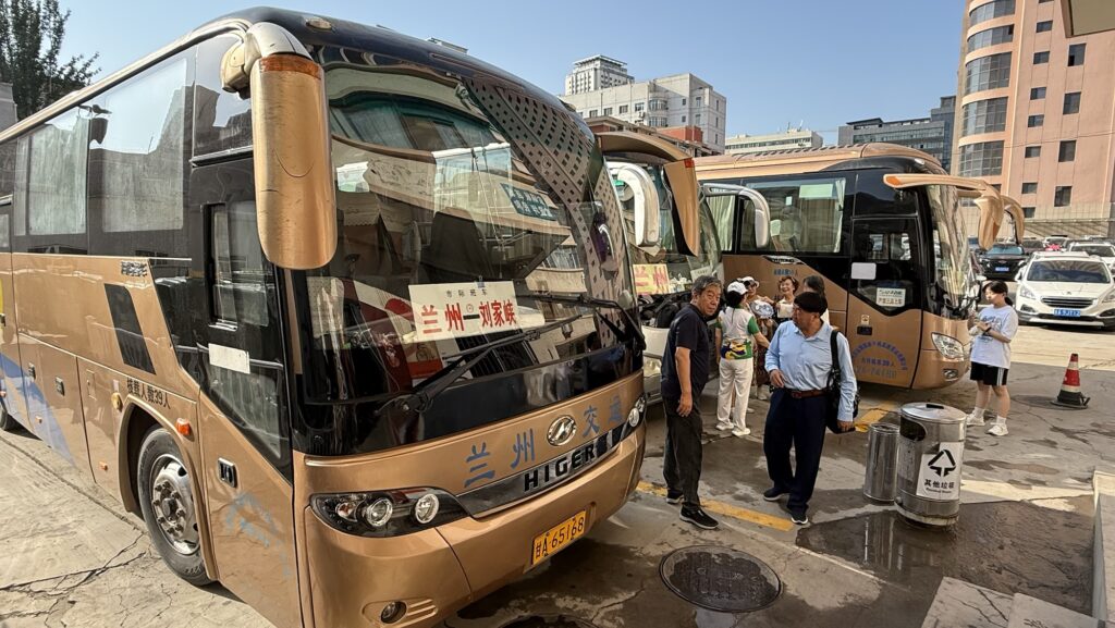 ターミナルから出てプラットフォーム(というよりは駐車場)へ行くと、劉家峡行きのバスが数台停まっています。