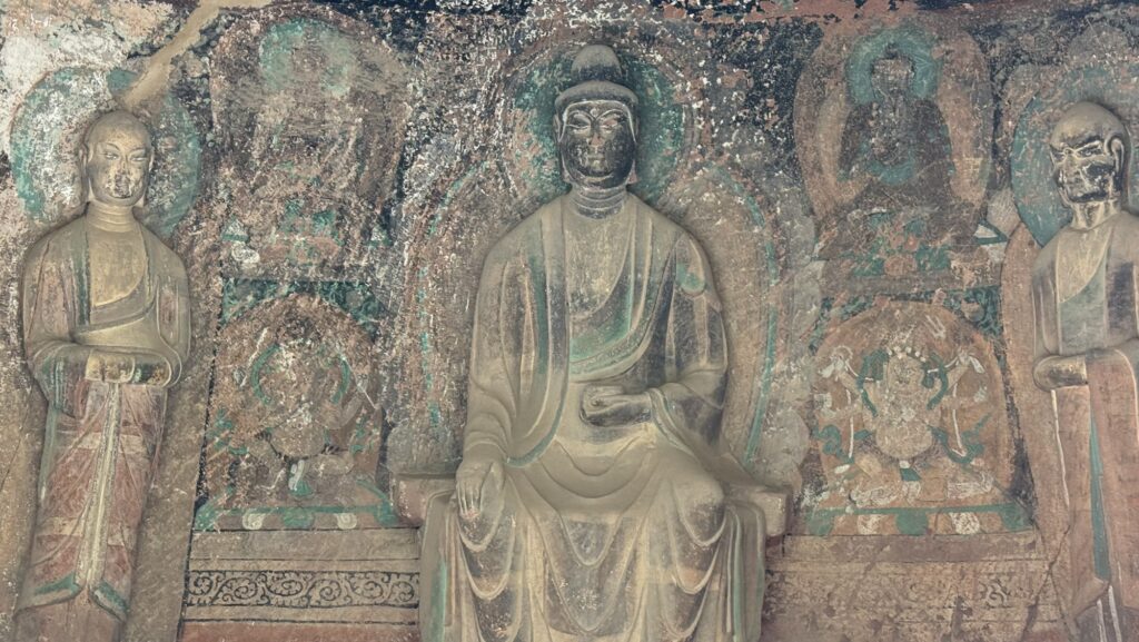 主尊の釈迦坐像は、衣の襞や顔立ちにガンダーラの影響が見られ、両脇侍の菩薩像や弟子像とともに整然と配置されています。壁面には浄土変や本生図が描かれ、当時の彩色が部分的に残っています。彩色は赤、緑、藍を基調とし、敦煌莫高窟の初期壁画とも近い技法が用いられています。