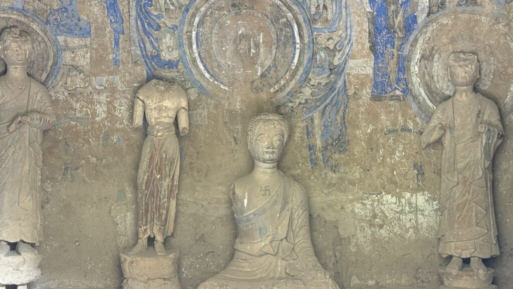 第172窟は北朝時代(北魏~北周期)に開かれ、三尊仏と両脇侍を配した正壁・南壁構成の造像が認められます。 また、北壁下部には五体の立像(五如来像)が設けられています。