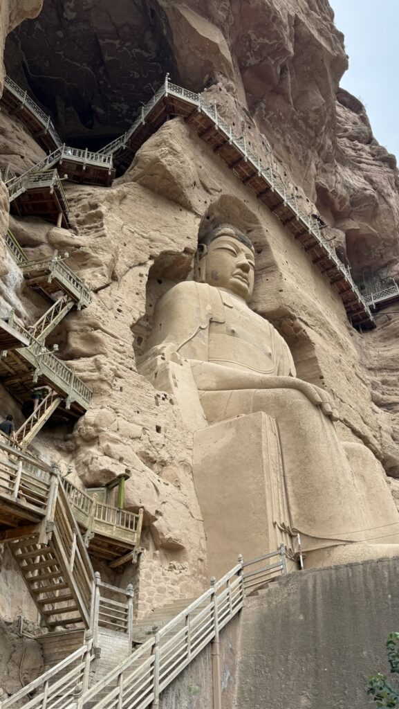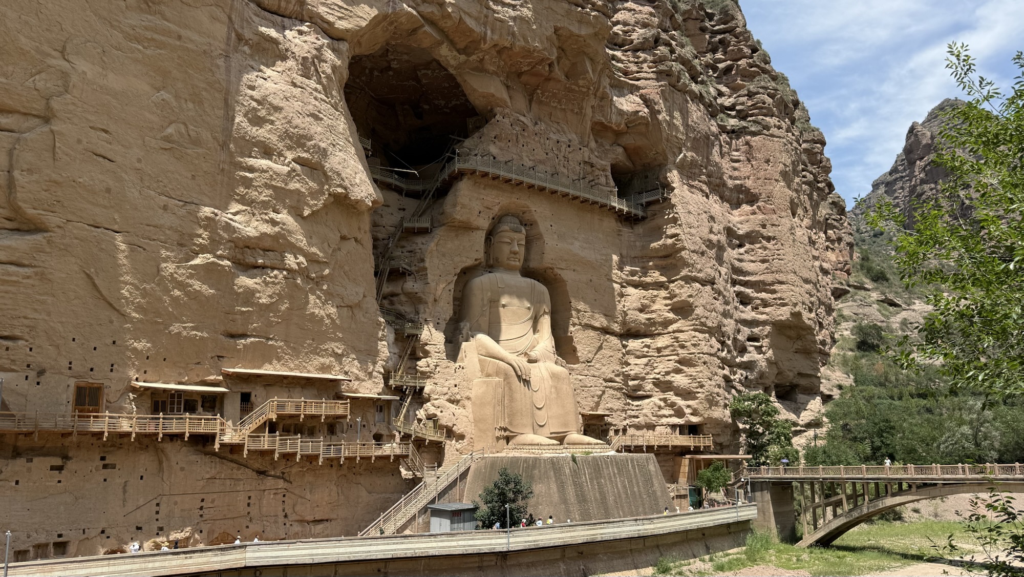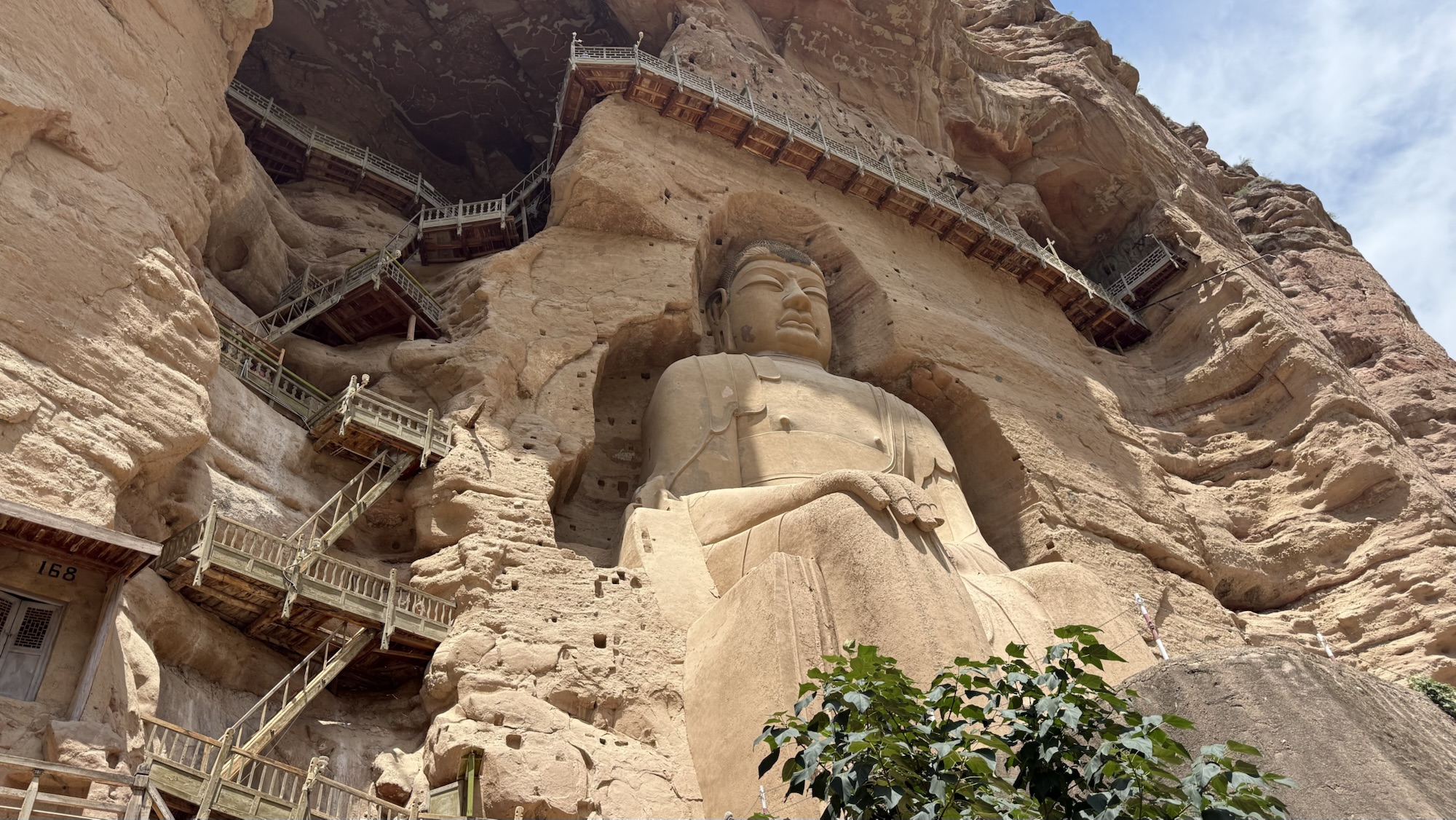 西秦の建弘元年(420年)に最初の窟が掘られたとされ、中国石窟造営史の中でも最古級の題記が残る遺跡です。黄河の峡谷に沿って約200メートルにわたり石窟が連なり、現存する洞窟は183、石彫像694体、泥塑像82体、壁画は約900平方メートルに及びます。窟は4層構造をなし、崖面に架けられた桟道を通って巡拝するよう設計されています。