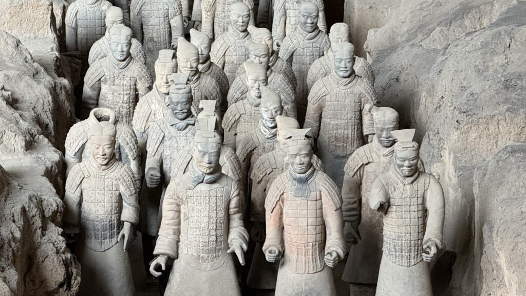これらは秦の始皇帝が死後の世界でも統一国家を守るために造られたと考えられています。実物の兵馬俑は実際の兵士とほぼ同じ大きさで、髪型や服装、表情までが異なり、役職や隊列を再現しています。