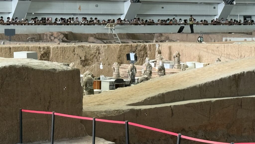 人混みの間を縫って手すり側へ行くと、とてつもなく広い坑全体と整然と並ぶ陶製の兵士や馬の軍列が見渡せます。これは圧巻です。