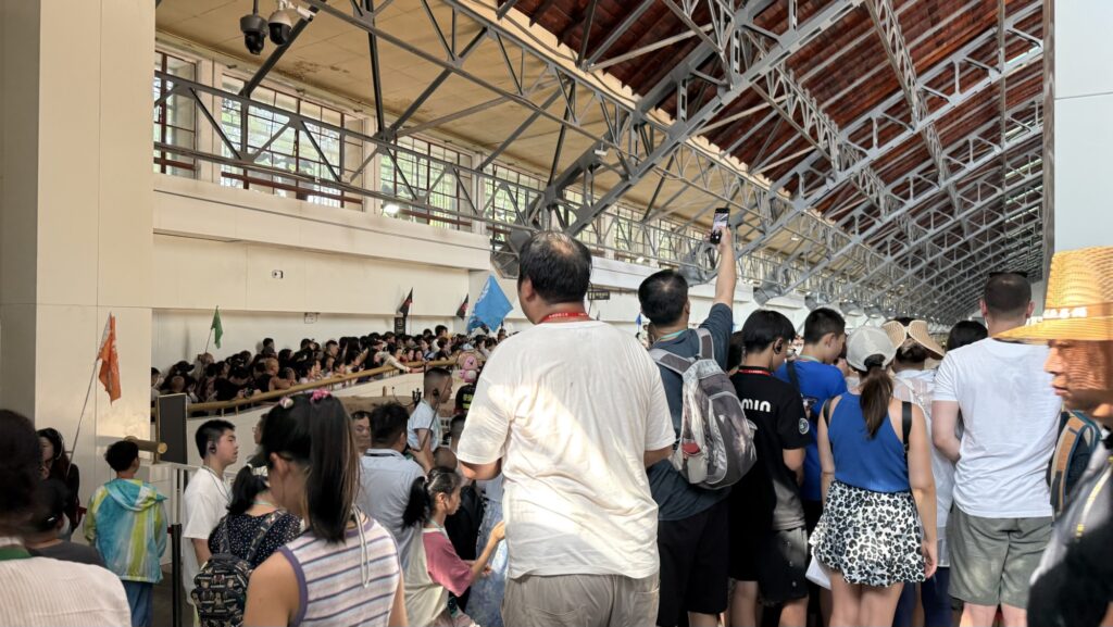 坑の上部は大きな屋根で覆われています。建物の中に入ると坑を囲むように観覧用の通路が設けられています。平日の朝一番ですがすごい混雑です。