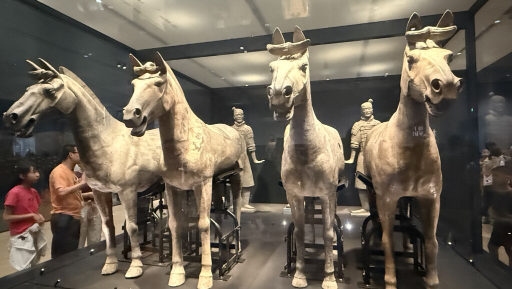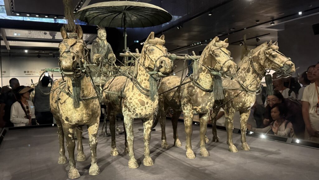 復元された秦始皇帝銅車馬。実物の二分の一くらいのスケールで、副葬坑から発見されたもの。肉感とか、馬具の精緻さとかがすごい。