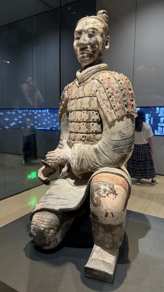 発見当初の陶俑は鮮やかな彩色が施されていましたが、空気に触れると数分から数時間で顔料が剥離し、現在のような素焼きの土色に変わってしまったそう。