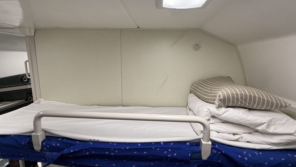 一室あたり3段二列の寝台席の一番上。寝転がれるので一等車より快適です。
