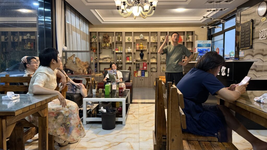 言葉がわからないので想像ですが、崋山がいかに名山かということを語っているよう。途中で入ってきたお客さん、チェックインできず放置されてますけどいいのかな。