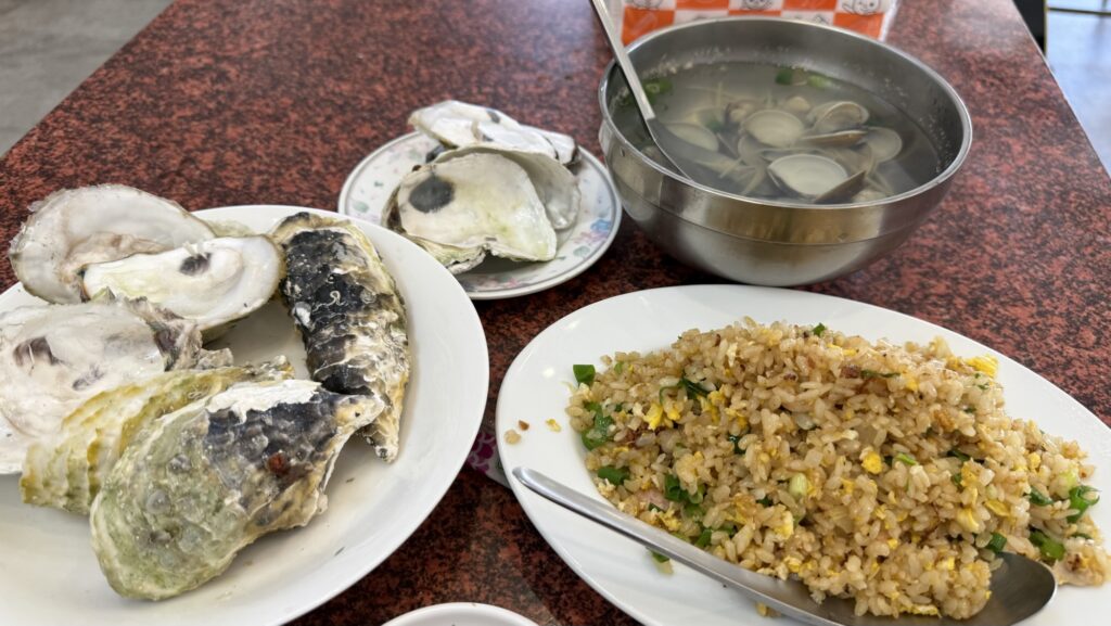 昼食は近くでよさげな食堂「邵老師 生壕海鮮」へ。蒸し牡蠣は一皿7枚くらいで150台湾ドル(約740円)。