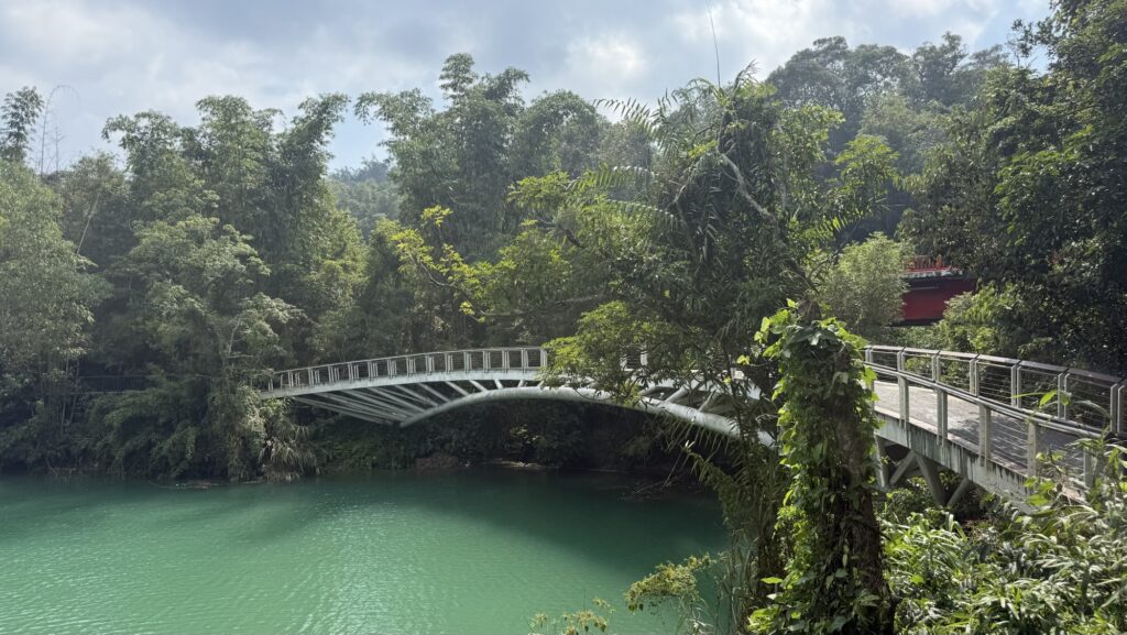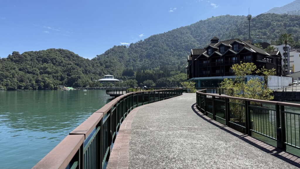 特に水社から向山ビジターセンターまでの約3.4キロメートルの区間は「向山段」と呼ばれ、湖面に道が張り出した「水上自転車道」が含まれる設計が特徴です。ルート上には永結橋や同心橋といった白い橋が架かり、終点の向山ビジターセンターは日本の建築家・団紀彦氏が設計したコンクリート打ち放しの建築物として知られています。