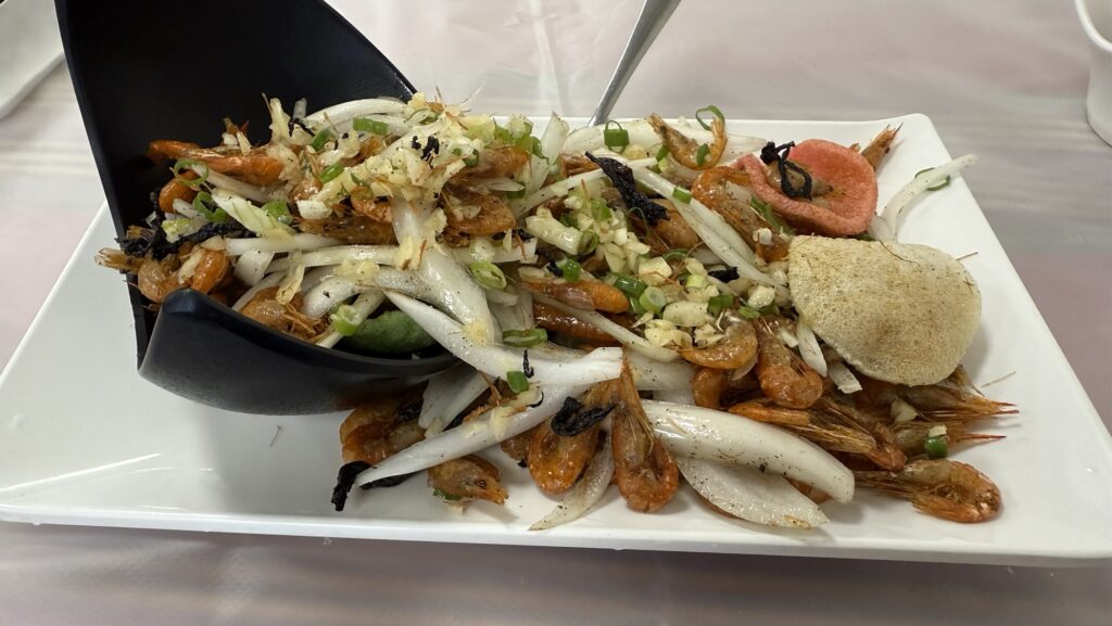 「阿薩姆潭蝦(アッサムタンシャ)」。「炸潭蝦(ザータンシャ)」という日月潭の川エビの揚げ料理と名物のアッサム茶をかけた語呂合わせ的なもの……だと思う。