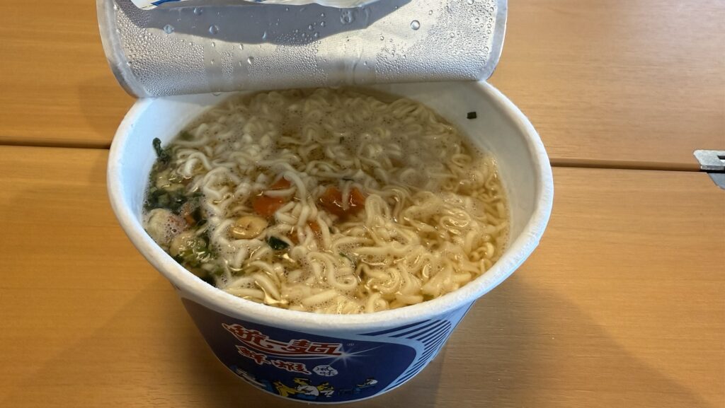 売店の営業時間を逃したので自販機のカップヌードルで昼食。現地版シーフードヌードル的な感じのやつ。