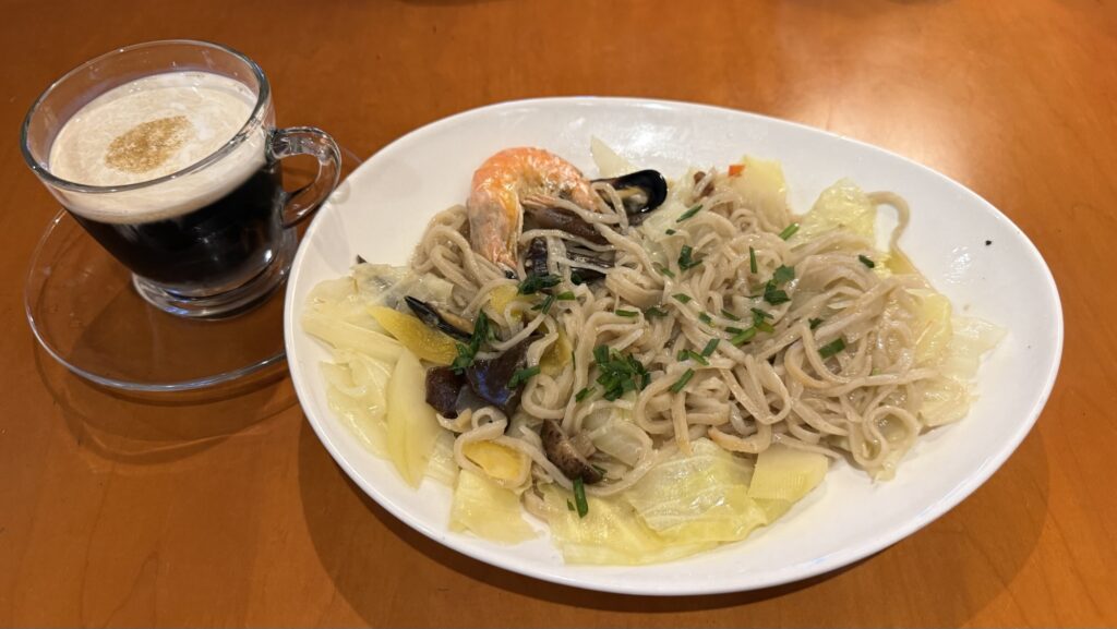 海鮮手工魚麺とアイスコーヒーで500台湾ドル(2,450円)とちょっと高め。麺はパスタっぽくもありちゃんぽんぽくもありラーメンぽくもある不思議な感じですが美味しい。