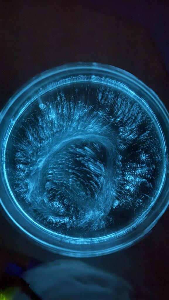 部屋を暗くして、スポイトとかで刺激するとうっすらと発光します。係員の方に携帯を渡すとプロっぽい感じで写真を撮ってくれました。
