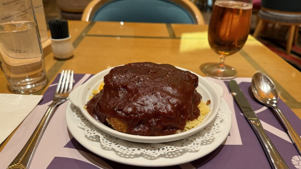 「新葡京焗豬扒飯(Baked Pork Chop with Fried Rice in “Grand Lisboa Style”)」で130パタカ(約2,400円)。ポルトガル的なポークチョップを中国風の炒飯に乗せたマカオ料理って感じです。