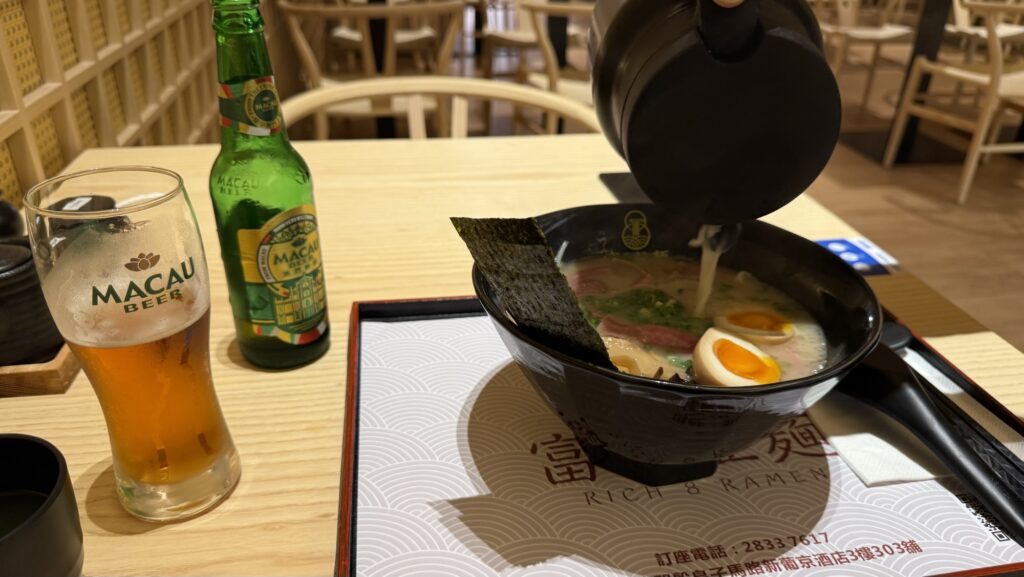 勝負の後の夕食。 ホテル内のレストランで 「A5和牛豚骨湯ラーメン」228パタカ(約4,200円)。負けたくせにこんなもの食べるなって感じですが。