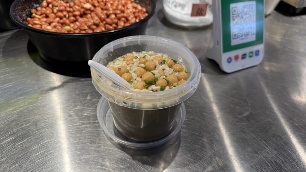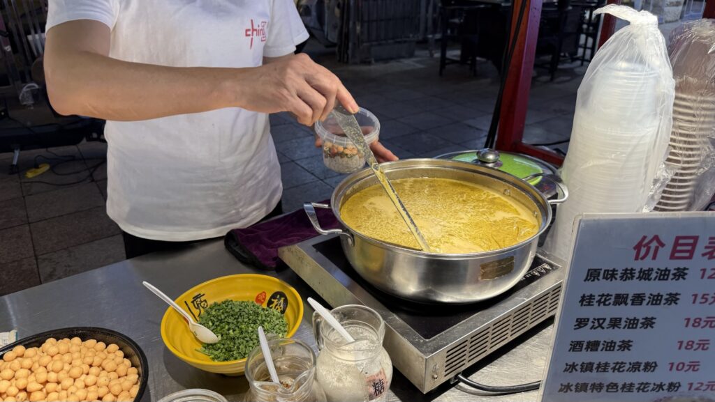 この屋台のは「桂花飘香油茶」という名で桂花(金木犀)の香りが立つようにしたもの(15元、約300円)。お茶漬けみたいなイメージですがちょっとスパイシーでサクサクしてます。